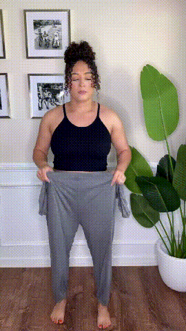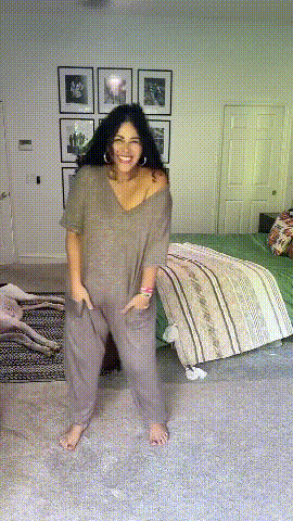 "The jumpsuits loose without being too baggy. I love that I can pull the legs up or down, just like joggers, and it looks good off the shoulder or on!"